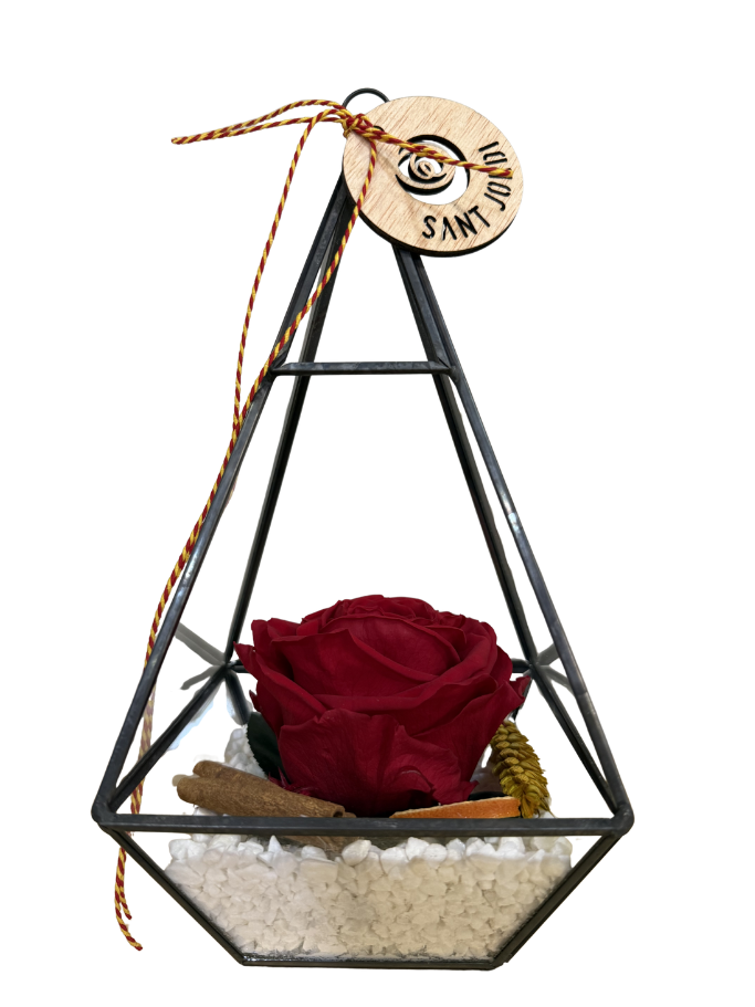 Rosa preservada en una cúpula triangular de cristal, altura aproximada 20 cm